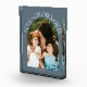 Modern and minimal family memory photo block featuring a photo in a arch frame with a text that says "Love Grows Here" with tiny hearts. Slate blue.