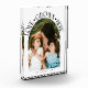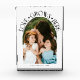 Modern and minimal family memory photo block featuring a photo in a arch frame with a text that says "Love Grows Here" with tiny hearts. White.