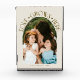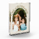 Moderne und minimalistische Familien-Erinnerungs-Fotoblock mit einem Foto in einem Bogenrahmen mit einem Text, der "Love Grows Here" mit kleinen Herzen sagt. Creme.