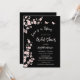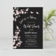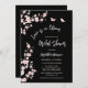This elegant blush pink and black bridal shower invitation showcases the saying 'Love is in bloom,' adorned with beautiful blush pink cherry blossoms and two butterflies on a black background. The backside includes a QR code for the person of honor's gift registry.