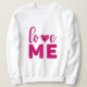 This design features the phrase “love ME” in a bold and expressive style. The word “love” is written in lowercase, while “ME” appears in bold uppercase letters, creating a strong visual contrast. The letter “o” in “love” is replaced by a pink heart filled with tiny heart shapes, adding a sweet and affectionate touch. The entire text is pink against a black background, giving the design a modern and striking appearance.