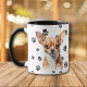This mug for the Chihuahua dog owner features an artist's watercolor portrait of an adorable brown and white Chihuahua. The image is printed twice, and between them is text that says "Love my CHIHUAHUA". The images are placed on a background sprinkled with black paw prints. You may easily change the text to something else, or personalize it, if you'd like.
