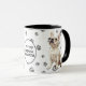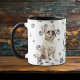 This mug for the French Bulldog owner features an artist's watercolor portrait of a beautiful white French Bulldog. The image is printed twice, and between them is an oval with the black text that says "Love my French Bulldog". The oval and dog images are placed on a background sprinkled with paw prints. You may easily change the text to something else, or personalize it, if you'd like.