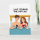 This greeting card shows a sweet couple tucked into bed under a teal blanket, with a warm wooden headboard behind them. The man has neat brown hair, and the woman has long auburn hair, and both have slightly rosy cheeks and small, relaxed smiles. Each of them is holding a smartphone, which adds a real-life touch while still feeling caring and close. The background is plain white, so the teal bedding and the woman’s red camisole stand out right away. At the top of the card, the words “I LOVE SPENDING TIME WITH YOU” appear in a handwritten script style, set in dark lettering across the upper area. The message pairs nicely with the scene, showing that being together matters even when you’re doing your own thing. It’s a calm, affectionate design that fits romance or close friendship, with a cozy feel ❤️💌.