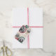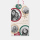 Winter holiday gift tags with your custom photos on colorful circles. Customizable text "Love and peace", and your family name.