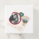 Winter holiday favor or gift hang tags with your custom photos on red and neutral circles. Customizable text "Love and peace", and your family name.