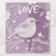 Lavender and plum highlight a white songbird perched delicately upon an entwined branch. Intricate floral patterns of leaves and swirling vine motifs