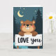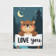Designed with a sweet nighttime woodland scene, this card features a cute brown beaver or groundhog centered on the front. It has big buck teeth, rosy cheeks, and wide eyes that look straight at you with a friendly, happy expression. The animal holds a bright white sign in both paws, and the words “LOVE you” are written on it in a casual hand-lettered style, with the text placed right in the middle. Behind it, deep teal evergreen shapes form a forest, and a crescent moon and small stars sit high in the dark sky. A calm stream runs along the bottom with soft blue ripples, adding a peaceful feeling. The whole picture feels quiet and caring, like a small moment you want to share with someone close 🥰. It’s a simple way to say you care, whether it’s for a partner or a good friend ❤️