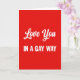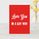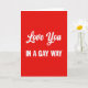 This card keeps things simple and direct, with a solid bright red background that feels full of love and pride. In the center, the words “Love You” appear in white cursive script with smooth, flowing letters. Just below that, “IN A GAY WAY” is written in white all-caps block letters that look like a straightforward sans-serif font. The mix of soft script on top and firm block text underneath makes the message feel both tender and confident. There are no characters or extra objects, so your attention stays on the words and what they mean. The overall look is modern and clear, celebrating affection and queer love without any distractions. It’s a great choice for a partner, friend, or anyone you care about ❤️