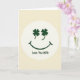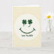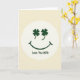 This card features a simple smiling face centered inside a soft off-white oval, set on a creamy beige background. Instead of eyes, two four-leaf clovers in deep green look outward, like a sweet little glance that feels affectionate and close 💚. A curved green line beneath them forms a wide smile, keeping the design balanced and calm. Below the face, the words “Love You Wife” sit neatly in a flowing green font, aligned under the oval so the message feels gently anchored. The muted creams and earthy greens create a cozy, intimate look, like a quiet moment shared between two people ☘️. The open space around the oval gives the clover eyes and smile room to stand out without feeling busy. The clovers are placed evenly as the eyes, with the green smile centered beneath them, and “Love You Wife” in green directly below on the beige field.