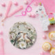 Verleihen Sie Ihrem festlich gedeckten Tisch mit diesem First Bloom LoveBird Party-Teller eine romantische Note. Mit einem Paar zarter Vögel, umgeben von rosafarbenen und elfenbeinfarbenen Blumen, sanftem Grün und einem eleganten Banddetail, bringt dieses Design eine botanische Schönheit im Stil von Erbstücken zu Verlobungsfeiern, Bridal-Events, Gartenpartys und Frühlingsfesten.