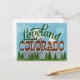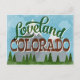 Loveland Colorado neo vintage Reise Poster Wand Kunst im Cartoon Retro-Stil. Es zeigt schneebedeckte Berge und Wälder unten mit lustigen und fröhlichen Retro-Text.