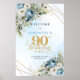 Celebrate a remarkable milestone with this elegant 90th birthday welcome sign featuring watercolor dusty blue and white flowers, soft eucalyptus greenery, and a delicate gold frame. Perfect for a boho, rustic, or classic celebration, this floral poster creates a warm, sophisticated entrance and sets the tone for a memorable birthday party.