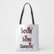 Große weiße Tasche mit schwarzem Griff, schwarze und rote Buchstaben, "Lovin Line Dancin", Musik, Tanz, Unterhaltung, Shopping,