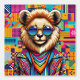 Das Bild ist eine digitale Illustration eines Löwen, der in stilvoller Weise gekleidet und in der Mitte vor einem lebendigen und farbenfrohen geometrischen Hintergrund stehend ist. Das Tier hat eine runde Sonnenbrille mit blauen Linsen und eine Jacke mit bunten geometrischen Mustern. Die Pose und das Zubehör des Tieres legen ein cooles und selbstbewusstes Verhalten nahe. Die Kulisse besteht aus einem kaleidoskop von Farben, darunter Gelb, Rot, Blau, Orange, Braun und Grün, bestehend aus verschiedenen unregelmäßigen geometrischen Formen, die zu einer lebhaften und dynamischen Atmosphäre beitragen.