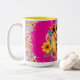 Schöne rosa und gelbe Tasse mit Löwe umgeben von Blume.