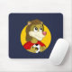 Mousepad mit Darstellung des Kopfes niedlich lächelnder Löwenkleid in rotem Sportkleid mit einem Fußball, in gelben Kreis, illustriert von Radka Kavalcova