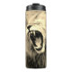 Diese Trommel hat ein Bild eines Löwes auf ihr.