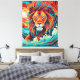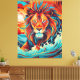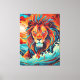 Lion's Fire Dance Canvas Print Vibrant Leinwand drucken einen majestätischen Löwen, umgeben von wirbelnden Wellen und flackernden Flammen und schaffen einen faszinierenden Tanz von Farben und Elementen.