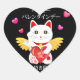 Niedliche und humorvolle Maneki Neko (Lucky Cat) mit Flügeln, die ein Herz mit "Liebe" für den Valentinstag halten. "Happy Valentine's Day" und "Maneki Neko (Lucky Cat)" auf Japanisch.
