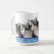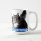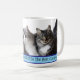 Enjoy your morning coffee with this funny tabby lucky cats' photo mug, a gift dedicated to a cat lover, humor quote in a blue rectangle round corners shape, cats' photo is generative content. Customize the photo with your own cat's one, using the Replace Background in Edit options