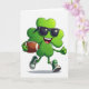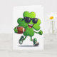 This card shows an upbeat, anthropomorphic four-leaf clover striding forward on a bright white background, its rounded leaves shaded in rich green with a glossy shine 💚. The clover flashes a wide grin with white teeth and a pink tongue, and dark sunglasses tilt across its face like it’s sharing a private joke with you. In its left hand, it holds a brown American football with crisp white laces, while the right hand gives a friendly thumbs-up that feels like a supportive nudge from a close friend ☘️. Any greeting text is placed up top in green, with smaller lines near the bottom in a darker green for balance. The outlines are strong and smooth, making the character stand out clearly against the open space. Dark green sneakers with bright white laces and white soles keep the motion going, and one shoe carries a small white cross emblem near the side. Share a little St. Patrick’s Day cheer with someone you care about, and let the glossy clover, sunglasses, and football take center stage on the white backdrop.