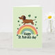 This card shows a glossy brown dachshund outlined in black, leaping with a little grin as if it’s bounding toward someone it adores. A softly colored rainbow 🌈 arches beneath it in gentle pastel bands, giving the pup a sweet “meet-me-here” stage for a friendly or romantic hello. Deep green three-leaf shamrocks ☘️ drift around the scene like scattered confetti, filling the space without crowding the main figure. The background is a smooth lime-green wash that keeps everything bright and springlike, with no heavy shadows. The dog’s wide eyes and lifted paw suggest an eager, affectionate greeting, like it’s reaching out to a close friend. Centered near the bottom, the phrase “Happy St. Patrick’s day” appears in deep green lettering that stands out clearly against the light backdrop. The rainbow’s soft pinks and blues sit just above the text, while shamrocks float across the top and sides around the jumping dachshund.