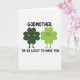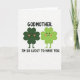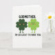 This card features two friendly four-leaf clovers standing close together on a bright white background, their little bodies angled as if they’ve just leaned in for a shared joke. One clover is a deep forest green and the other is a lighter lime green, and both have tiny black dot eyes, small curved smiles, and soft rosy cheeks that make them look fond of each other 💚. Their short stems sit side by side, reinforcing the sense of closeness and support. Across the top, “GODMOTHER.” appears in black, all-caps lettering, centered and spaced to feel steady and important. Along the bottom, the line “I’M SO LUCKY TO HAVE YOU.” is also set in black, all caps, centered beneath the characters, tying the message to the lucky clover theme ☘️. The simple layout leaves plenty of white space around the pair, keeping the focus on their gentle expressions and matching blush. The two green clovers stand in the middle with their rounded leaves nearly touching, framed by the top and bottom black text.