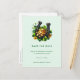 Save the Date Postkarte mit einem Motivbild zum St. Patrick's Day. Ein schwarz-goldenes Hufeisen sitzend in einem grünen Kleeblatt mit glänzenden Goldmünzen.