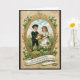This card features a vintage-style illustration set inside an ornate gold oval frame, with tiny white clover blossoms and three-leaf clovers tucked into the decoration and small harp shapes along the sides. In the center, a young boy and girl stand close together in a green meadow dotted with little wildflowers beneath a pale, cloud-speckled sky 🌷. The boy wears a deep green suit with knicker-style shorts and a matching cap, and he leans in as he helps hold one side of a golden pot brimming with coins. The girl, in a white ruffled dress with green ribbons and a matching headband, steadies the other side, her posture angled toward him like they’re sharing a secret task. Their rosy cheeks and soft expressions suggest a shy friendship, with their hands meeting at the pot as if they trust each other to carry it. Around the vignette, the background is a warm, aged cream tone with faint timeworn marks, and a curling banner runs along the bottom with a short message printed in dark lettering. The gold frame gleams against the cream paper, and the banner’s ends curl upward beneath the clover accents 🐇.