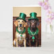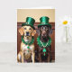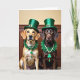 This card features two Labrador retrievers sitting close together, one golden and one chocolate-brown, facing forward with calm eyes that feel like a shared, steady bond. Each wears an emerald-green top hat with a small gold buckle, adding a St. Patrick’s Day touch ☘️. Around their necks are white pearl necklaces that catch the light, resting against ruffled green collars like festive little capes. A shamrock pendant hangs from each strand of pearls, centered on their chests as if they’re dressed up for the same special occasion 💚. The background is warm and simple, with soft wood paneling that suggests a cozy indoor room. Any greeting text sits above the dogs in green lettering, with a smaller line below in gold to balance the hats and buckles. Gentle lighting brings out the fur texture and the smooth shine of the pearls against the deep green fabric and the warm tan backdrop.