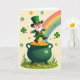 This card shows a smiling leprechaun in an emerald suit and tall green hat with a gold buckle, stepping up from a deep green pot that’s overflowing with shiny coins ☘️. He holds his arms wide as if greeting a close friend, his rosy cheeks and full white beard giving him an easy, welcoming look. At the bottom, bright green grass frames the scene, guiding your eye up through the spilling gold and toward the character’s cheerful face. The background is a creamy, light tone sprinkled with soft shamrock shapes, some crisp and some faded for a layered feel. A gentle pastel rainbow 🌈 curves near the top, adding a soft glow above the action. The greeting text sits near the upper area in green lettering that stands out against the pale background, leaving the leprechaun and gold as the main focus. Gold coins tumble in a curved stream from the pot’s rim, catching little highlights as they scatter across the center of the design.