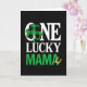 This greeting card features stacked, centered text reading “ONE LUCKY MAMA” on a deep black background, with the words arranged in neat tiers that guide your eye from top to bottom. The “O” in “ONE” is replaced by a three-leaf shamrock, its heart-shaped leaves filled with a green-and-black buffalo check that adds a cozy, down-to-earth touch ☘️. “ONE LUCKY” appears in crisp white lettering, while “MAMA” sits just below in a rich emerald green that feels like a warm nod to St. Patrick’s Day 💚. A small golden horseshoe rests near “MAMA,” angled upward like a little charm tucked close for someone you care about. With no characters on the scene, the affectionate tone comes through in the way the lucky symbols lean in toward the word “MAMA,” like a gentle hug made from icons and type. The layout stays tightly centered, keeping the message front and forward, with the shamrock acting as the focal point at the top. The black backdrop leaves plenty of breathing room around the white and green text, making the shapes and colors stand out sharply. The final visual detail is the tiny gold horseshoe sitting beside the green “MAMA,” glowing softly against the dark background.