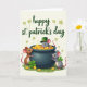 This card shows a dark cauldron overflowing with shiny gold coins, like a treasure find at the end of a rainbow 🌈. Three little mice gather close around it, creating a sweet, friendly scene that feels like they’re sharing a secret discovery together. In the middle, a grey mouse wearing a green leprechaun hat leans into the pile, its bright eyes fixed on the coins as if it can’t believe its luck 💚. On the left, a brown mouse rests its paws on the rim and looks across toward the others, as though checking that everyone gets a turn, with a four-leaf clover tucked near its feet ☘️. On the right, another grey mouse holds a small shamrock and tilts its head upward with a warm grin, its pink ears and nose adding a gentle touch of color. The mice stand on a rounded patch of green ground with a few scattered coins around their feet, suggesting the pot has been spilling over. Across the top, the words “happy st. patrick’s day” appear in green lettering, with small shamrocks floating nearby on a light cream background.