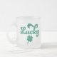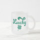 Teilen Sie das Glück der Iren mit unserer Vintag inspiriert St Patrick's Day mattierte Glas-Tasse. Design bietet "Glück" in smaragdgrünen Retro-Bubble-Schrift-Typografie und eine vierblättriges Kleeblatt Abbildung mit einem beängstigenden Vintagen Effekt.