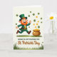 This card shows a cheerful leprechaun with a fiery orange beard and rosy cheeks striding in from the left, his grin aimed toward the treasure like he’s sharing a private joke with a friend 💚. He wears a deep emerald top hat and matching suit with green shoes, set off by a golden waistcoat and belt that catch the light. On the right, a pot brims with gold coins, and several coins hang in midair as they tumble down, adding a lively sense of motion ☘️. The background is a soft light cream, sprinkled with small dark green four-leaf clovers that feel like little winks across the page. Along the bottom, a narrow band of green grass grounds the scene and frames the characters like a simple stage. The message “WISHING YOU A POT OF HAPPINESS THIS St. Patrick’s Day” is placed prominently across the upper area in dark green lettering, easy to spot against the pale backdrop. The leprechaun’s gaze and forward step lead straight to the pot, as if he’s proudly offering the lucky find to someone close. A few bright coins glint above the pot while clovers dot the cream space behind them.