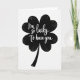 This card features a centered four-leaf clover in deep, textured black on a wide white background, with four rounded leaves that meet in a soft, heart-like shape. Across the clover, the message “I’m so lucky To have you” appears in luminous white lettering that curves gently with the form. The words sit right inside the dark shape, so it feels like a private note tucked close, like two friends leaning in or a couple sharing a quiet glance 💚. A slightly curved stem drops down from the clover, giving the simple layout a natural, grounded look. Instead of a flat fill, the black areas show an uneven, brushy texture, like charcoal softly rubbed across paper. The strong black-and-white contrast keeps everything focused on the clover and the message, with no extra scenery competing for attention ☘️. The clover’s edges stay crisp against the white space, and the textured black surface shows subtle streaks and grain throughout.