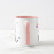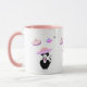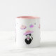 Niedliche Tasse mit einer glücklichen Tuxedokatze und fliegenden Untertassen. Der Text auf der rechten Seite kann personalisiert sein.