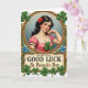 Designed with a vintage St. Patrick’s Day look, the card centers on a fair-skinned woman posed inside an ornate gold oval frame, meeting your eye with a gentle, inviting gaze that feels like a quiet hello from a close friend 💚. Her dark wavy hair falls around her face, and a bright red flower tucked near the curls adds a romantic accent against her rosy cheeks and coral lips. One hand, with red-polished nails, rests near her chin as if she’s mid-thought, giving the portrait a tender, intimate pause. She wears a blush-pink gown trimmed with soft white ruffles at the neckline and sleeves, and a rich green shamrock sits on her chest like a keepsake pinned there on purpose ☘️. Above the frame, larger four-leaf clovers balance the top of the design, while the lower border is dotted with smaller shamrocks and tiny blue flowers that trail along the bottom edge. The message appears on a decorative banner, with “GREETINGS GOOD LUCK St. Patrick’s Day” set in classic lettering that reads clearly against the ornate shapes. Gold detailing outlines the frame and banner, while greens, reds, and touches of blue stand out across the clovers, flower, and border accents.