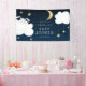 Herzlich willkommen in Ihrem lullaby Thema Babydusche. Illustration von Wolken mit einem sonnigen Blick aus einem von ihnen. Sie können den Namen des zu verwendenden Mommy und das Datum des Ereignisses hinzufügen. Es gibt goldfarbenen Mond und Sterne auf einem marineblauen blauen Hintergrund. Original Illustration und Design von Namibear Art Studio.