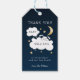 Sweet Gefallen Tag für Ihr lullaby Thema Babydusche. Illustration von Wolken mit einem sonnigen Blick aus einem von ihnen. Passen Sie dieses Produkt an, indem Sie den Familiennamen des Babys hinzufügen. Es gibt goldfarbenen Mond und Sterne auf einem marineblauen blauen Hintergrund. Original Illustration und Design von Namibear Art Studio.