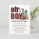 Rustikale Lumberjack-Babydusche mit einem schicken, weißen Hintergrund, der in jede Farbe verändert werden kann, einem Aquarellwald, Bären und Vögeln, den Worten "oh Junge" in einem roten Flanellgingham-Muster und einer modernen Baby-Party-Vorlage, die leicht zu personalisieren ist.