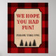Wir hoffen, dass du Spaß hattest! Bitte ein Zeichen nehmen Dieses bezaubernde Party-Schild zeichnet sich durch ein rotes kariertes Lumberjack-Design aus. Perfekt für Geburtstage oder Babyduschen!