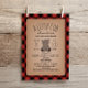 Eine Babydusche-Einladung, die eine Abbildung eines Babybären enthält. Personalisieren Sie den Text. Hintergrund ist rot und schwarz lumberjack kariert inspiriert Büffel karierte Muster.