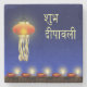 Happy Diwali Illustration: Eine glänzende Diwali-Lampe mit roten Diyas (tassenförmige indische Öllampen) mit einem Zierrahmen auf einem nächtlichen Himmelshintergrund und der Gruß in Sanskrit.