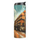 Dieses Bild zeigt einen roten Sattelwagen, der stark mit Stämmen beladen ist und auf einer Landstraße mit Geschwindigkeit fährt. Der Hintergrund zeigt einen dynamischen, malerischen Himmel mit Streifen von Licht und dunklen Wolken, was Bewegung und Geschwindigkeit suggeriert. Dunkle immergrüne Bäume reihen den Horizont ab, und Schmutzflecken oder Wasser sind um den LKW sichtbar, was das Gefühl der Bewegung verstärkt.