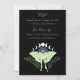 Eine lebendige grüne Lunamotte ist umgeben von Mondphasen und üppigen grünen Blätter auf schwarzem Hintergrund.