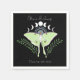 Eine lebendige grüne Lunamotte ist umgeben von Mondphasen und üppigen grünen Blätter auf schwarzem Hintergrund.