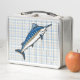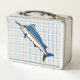 Nicht viele Fische sind unglaublich schön als das blaue Marlin — und nicht viele Fische sind größer. Das Blaue Marlin ist das größte der Atlantikmarline und, im Ernst, einer der größten Fische der Welt. Wie bei einigen Arten ist das Weibchen oft etwas größer als das Männchen. Weibchen können bis zu 4,5 m lang werden und mehr als 500 kg wiegen, obwohl der Durchschnitt mehr als 3,50 m lang und 150 kg schwer ist. Blau oben und silberweiß darunter, mit einer ausgeprägten Rückenflosse und einem langen, tödlichen, speerischen Oberkiefer (den einige als Schein bezeichnen), sind blaue Marline einer der am leichtesten identifizierbaren und erkennbaren Fische der Welt. Marlins sind bekannt für ihre unglaubliche Ausdauer in einem Kampf, wenn sie angezogen werden, was sie zu einem tropischen Favoriten von Großwildfischen macht. Obwohl man es auch von fast jedem supergroßen Fisch sagen kann, kann ich mir nicht vorstellen, dass es viel aufregender für den begeisterten Angler ist, als einen dieser Giganten zu hacken und zu sehen, wie er im Kampf Wasser bricht. Dieses Design ehrt diesen majestätischen Fisch mehr als die Angler, die ihn suchen. Für diese wunderbare Mittagspause springt ein blauer Single-Marlin (auf beiden Seiten) auf einem farblich koordinierten karierten Meer. Diese wunderbare Mittagsbox ist eine ausgezeichnete Wahl für den Vatertag, den Geburtstag des Vaters oder jeden Tag, an dem Sie Ihren Lieblings-Angler oder zukünftigen Angler feiern.