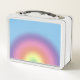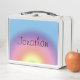 Regenbogen über den blauen Himmel. Personalisieren Sie die Vorderseite des Feldes mit Name. Es wird über den gewölbten Regenbogen im Script-Schriftart gedruckt. Regenbogen auf beiden Seiten. Wählen Sie die Farbe der Box aus - alle verfügbaren Farben passen gut zu den Farben des Regenbogens: grün, gelb, orange, rot, rosa, lila und blau.
